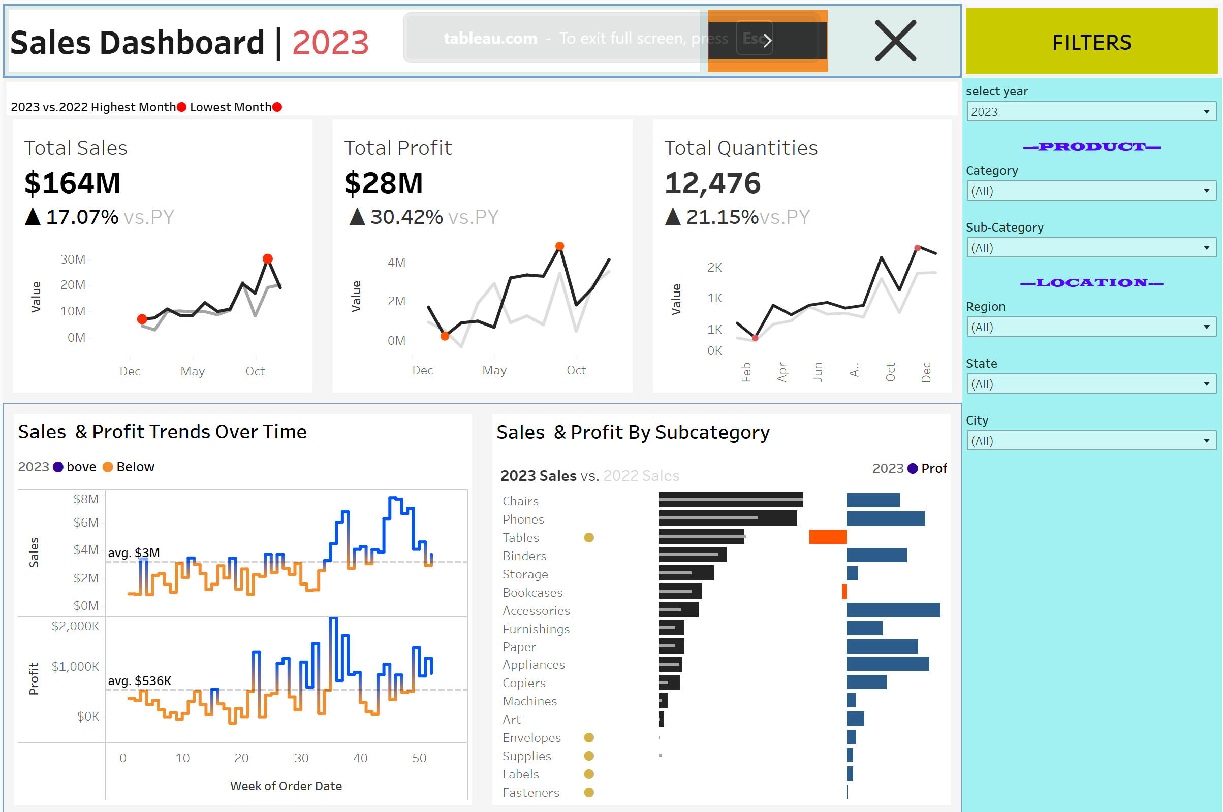 Filtering by product, subcategory, and location instantly updates all visuals, ensuring cohesive insights.2) Overall Business Growth:Sales increased by 17.07%, and profit rose by 30.42%, indicating strong financial performance.